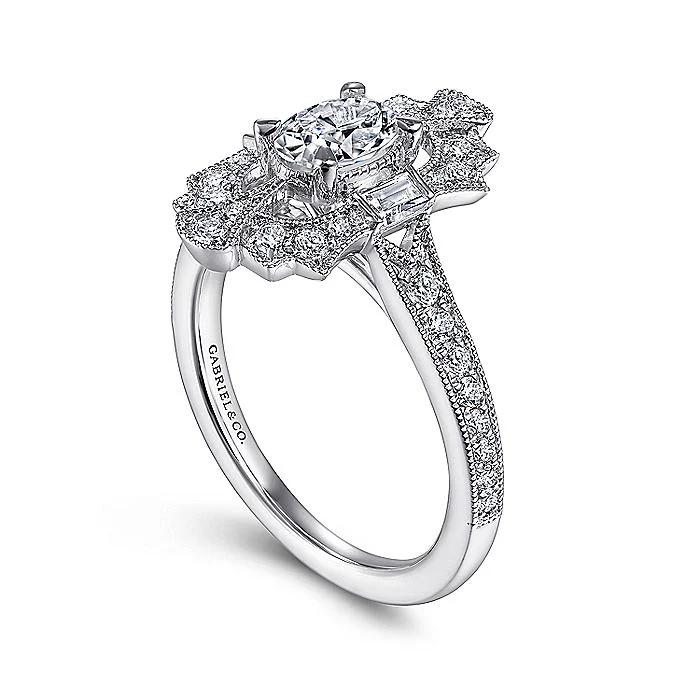 Gabriel & Co Art Deco White Gold Oval Halo Semi-Mount Engagement Ring—